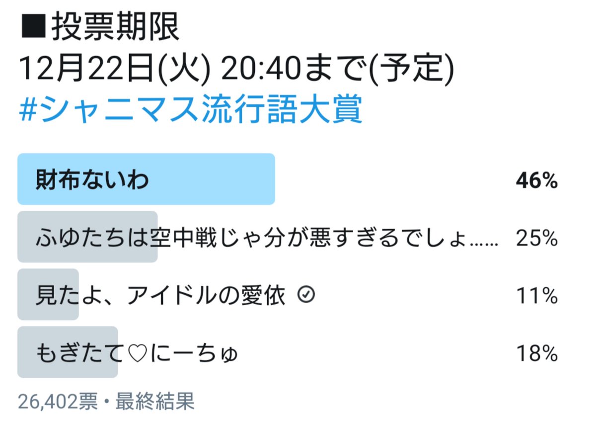 『シャニマス流行語大賞19』へのたくさんの投稿、ありがとうございました! 頂いた言葉の中から、ノミネートされた言葉を四つ紹介します! 毎日一つずつ紹介しますので、ぜひご覧下さいね♪ まず一つ目は「『オマエさ、そんな顔すんの反則』」です! #シャニマス #シャニマス流行語大賞 pictwittercom/DrKSAPapLj — アイドルマスター シャイニーカラーズ公式コロロン・ケルン @Coloron_Koeln RT @imassc_official 『シャニマス流行語大賞』にノミネートされた最後の言葉をご紹介します♪ 四つ目は「もぎたて♡にーちゅ」です! 以上の四つの候補の中から、12月22日 (火)の生配信で大賞を決定します! どうぞお 1 (月) IDkQXPAkjW0NIKUプロデューサーさん、お疲れ様です! 明日1700より、『シャニマス流行語大賞』の開催を予定しています! ふふっ、今年はどんな言